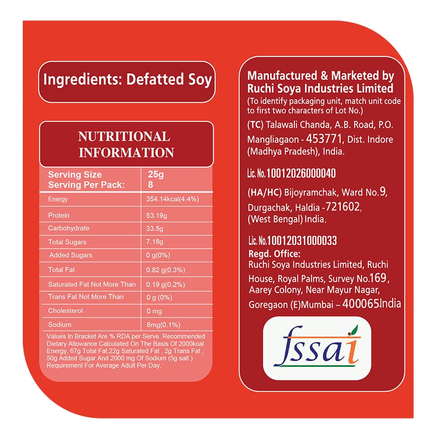 Nutrela Soya is one of the highest source of protein. It provides 52% best quality protein which is far higher than any other known sources of protein like Egg or Milk or Dal . We call it "Dhaakad Protein". It is also a good source of iron and calcium. Nutrela Soya is the most versatile ingredient in your kitchen add it with any dish and gift yourself a healthy diet.