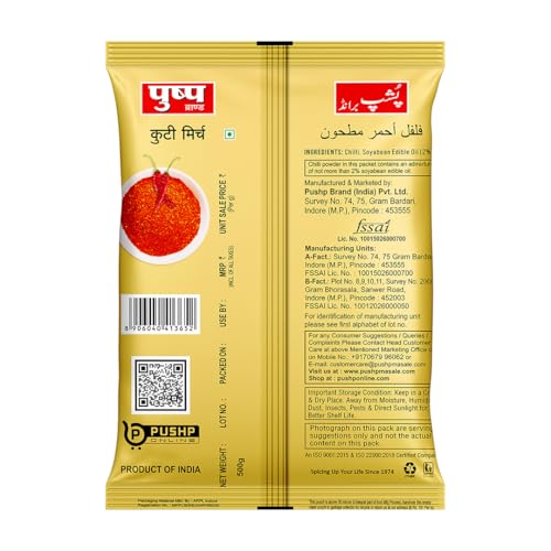 Bring home the bold essence of Indian cooking with Tikhi Kuti Mirch by Pushp Masale crafted to deliver authentic flavor and vibrant color to every meal. Made from handpicked sun-dried red chilies this crushed chili spice offers a perfect coarse texture that enhances both taste and aroma. Now available in a convenient 500g pouch Tikhi Kuti Mirch adds a fiery yet balanced heat to your dishes making it ideal for Indian recipes like curries dals pickles snacks and more. Whether you're preparing traditional meals or modern fusion dishes this red chili powder gives your food the depth and kick it deserves. 100% natural and free from artificial colors or preservatives this chili is hygienically processed and packed to retain its natural oils and freshness. The coarse grind not only brings out the spice but also gives your food a rich homemade feel. Trusted by generations Pushp Masale is known for delivering consistent quality and purity. Whether you're a home cook or a professional chef this spice is a must-have in your kitchen.