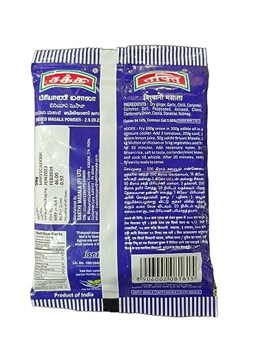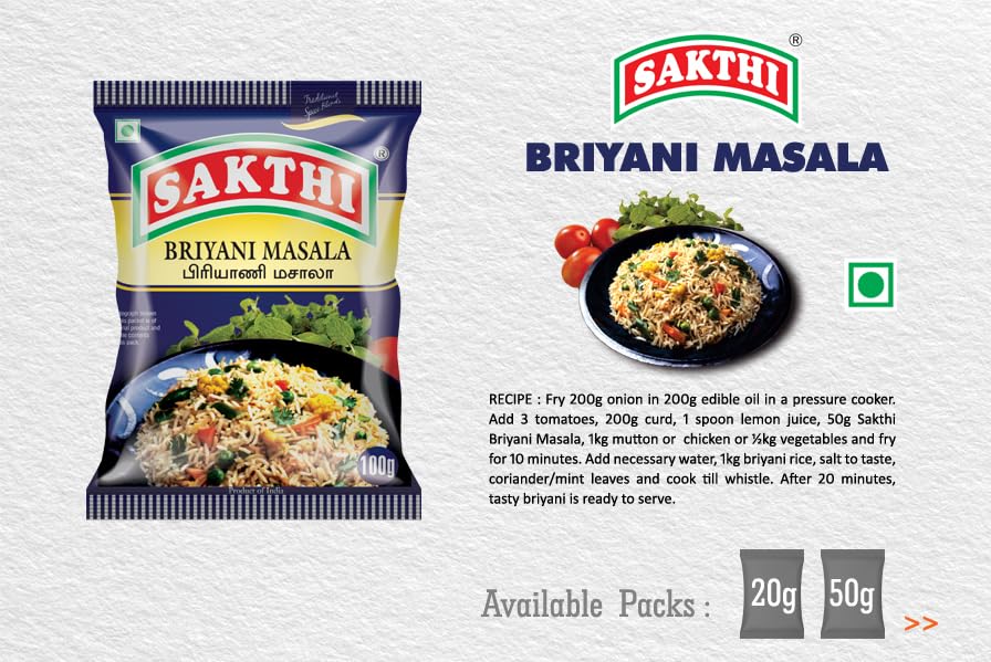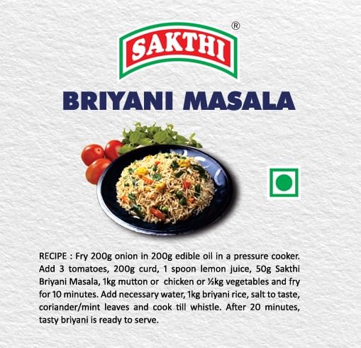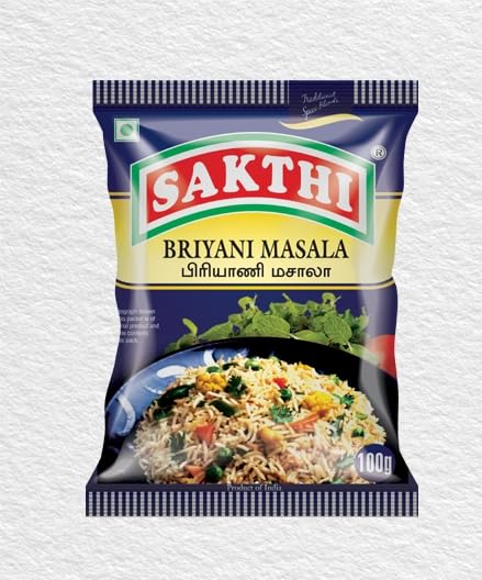 Sakthi Biryani Masala is a popular spice blend used in Indian cuisine specifically tailored for making biryani a flavorful and aromatic rice dish. Here are some key aspects of Sakthi Biryani Masala: Brand: Produced by Sakthi Masala a well-established brand known for its range of spice mixes and seasonings. Ingredients: Typically includes a combination of spices such as coriander cumin black pepper cinnamon cardamom cloves bay leaves nutmeg mace star anise etc. These spices are carefully selected and blended to create the distinctive flavor profile essential for biryani. Flavor Profile: Sakthi Biryani Masala offers a complex and aromatic flavor that enhances the taste of biryani dishes. It provides a balance of heat spice and fragrance characteristic of traditional biryani preparations. Usage: It is used to marinate meats (such as chicken mutton or seafood) and vegetables for biryani imparting a rich and authentic taste. The spice blend can also be added during the cooking process to enhance the layers of flavor in the dish. Packaging: Available in various packaging sizes typically with instructions on usage and storage. Versatility: While primarily used for biryani Sakthi Biryani Masala can also be experimented with in other rice dishes or adapted to suit individual preferences in cooking. Availability: Widely available in Indian grocery stores and online platforms making it accessible to home cooks and chefs alike. Sakthi Biryani Masala is valued for its quality ingredients and the convenience it offers in preparing authentic biryani dishes with the right blend of spices. It has become a preferred choice for many enthusiasts of Indian cuisine looking to achieve the perfect biryani flavor at home.