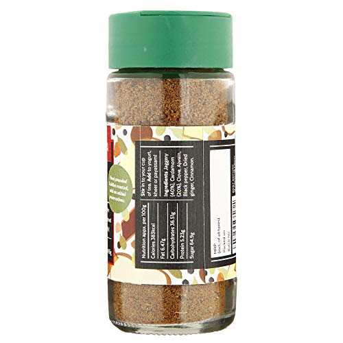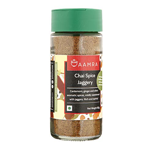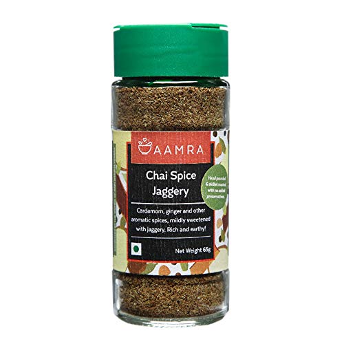 Aamra handmade chai spice jaggery 65 gm (chai masala with Gur)- rich aromatic & earthy | green cardamom and ginger sweetened mildly with jaggery. Hand pounded skillet roasted no artificial preservatives just stir in to your cup of tea. Add to yogurt kheer or payassam.