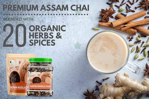 • UPPER ASSAM MASALA CHAI - Finest strong black tea from upper assam region infused with 20 organic real India spices including cardamom cinnamon bay leaf star anise turmeric and much more