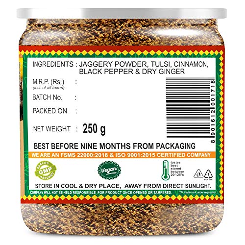 • Net Weight :- 500g (250gx 2 Packs); Ingredient :- Jaggery Powder Tulsi - Basil Cinnamon - Dal Chini Dry Ginger - Shunthi Adrak Black Pepper - Kali Mirch