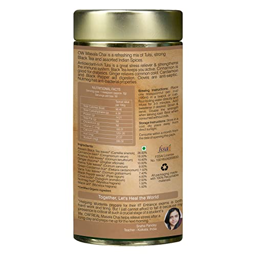Organic wellness masala chai is a refreshing mix of tulsi strong black tea and assorted indian spices. Antioxidant-rich tulsi is a great stress reliever and strengthens the immune system. Black tea keeps you active. Cinnamon is good for diabetics. Ginger helps to relieve common cold. Cardamon and black pepper help in digestion. Cloves are anti-septic. Nutmeg has anti-bacterial properties. Directions: place one teaspoonful per cup (120 ml) in a teapot or cup. Pour boiling water directly and infuse for 3-5 minutes. Add sweetener if desired. Strain & serve. Double the strength when serving iced. Best when consumed without milk.