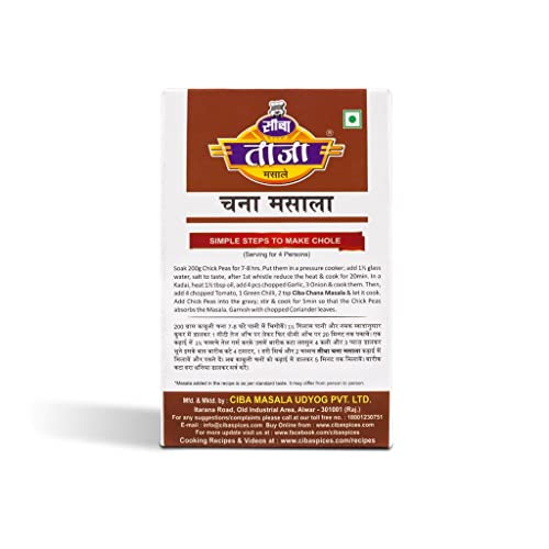 Chana Masala Powder (Chole Masala Powder) by Ciba Taaza Spices Retain Its Aroma Because it is in Stainless Steel Plant. Our Chana Masala Powder is a Blend of Natural Spices & Salts to Make Perfect Chana. No Preservatives. No Artificial Food Color. All Natural Ingredients. Shelf Life: 10 Months. Once Opened Keep it in an Airtight Container.