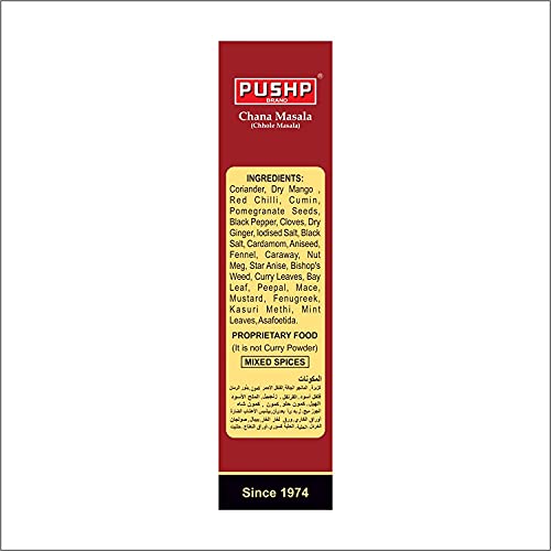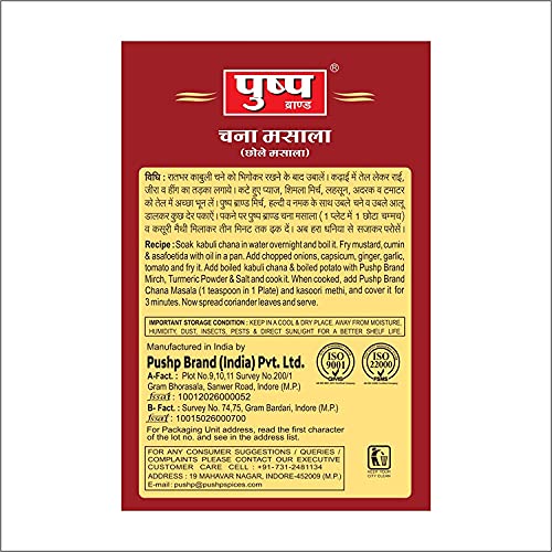 Product Features:- Fresh and 100% natural Made in India Easy to make Blend of perfect spices Add magic to your dishes Product Highlights:- âINGREDIENTS:- Coriander Dry Mango Red Chilli Cumin Pomegranate Seeds Black Pepper Cloves Dry Ginger lodised Salt Black Salt Cardamom Aniseed Fennel Caraway Nut Meg Star Anise Bishop's Weed Curry Leaves Bay Leaf Peepal Mace Mustard Fenugreek Kasuri Methi Mint Leaves Asafoetida. âEasy to prepare:- When you have Pushp chana masala in your hands you don't have to worry about the taste and flavor of your meals. All the Indian spices incorporate in one masala which will give you the melt watering taste and make your food flavoring and appealing. âQuality control:- Quality control is the quintessential aspect of any product. And we take care of it with utmost priority. For providing premium quality products at your home our team has keenly monitored all the products. Pushp chana masala has passed all the quality checks and hence it has become the number one choice of all Indian families and their kitchens. âBlend of natural spices:- Pushp chana masala has the perfect combination of all the Indian spices that make your food healthy appealing and delicious. All the Indian spices and seasonings have grounded at low speed that ensures the preservation of the natural oils. And you will get the perfect recipe of a restaurant directly to your kitchen.