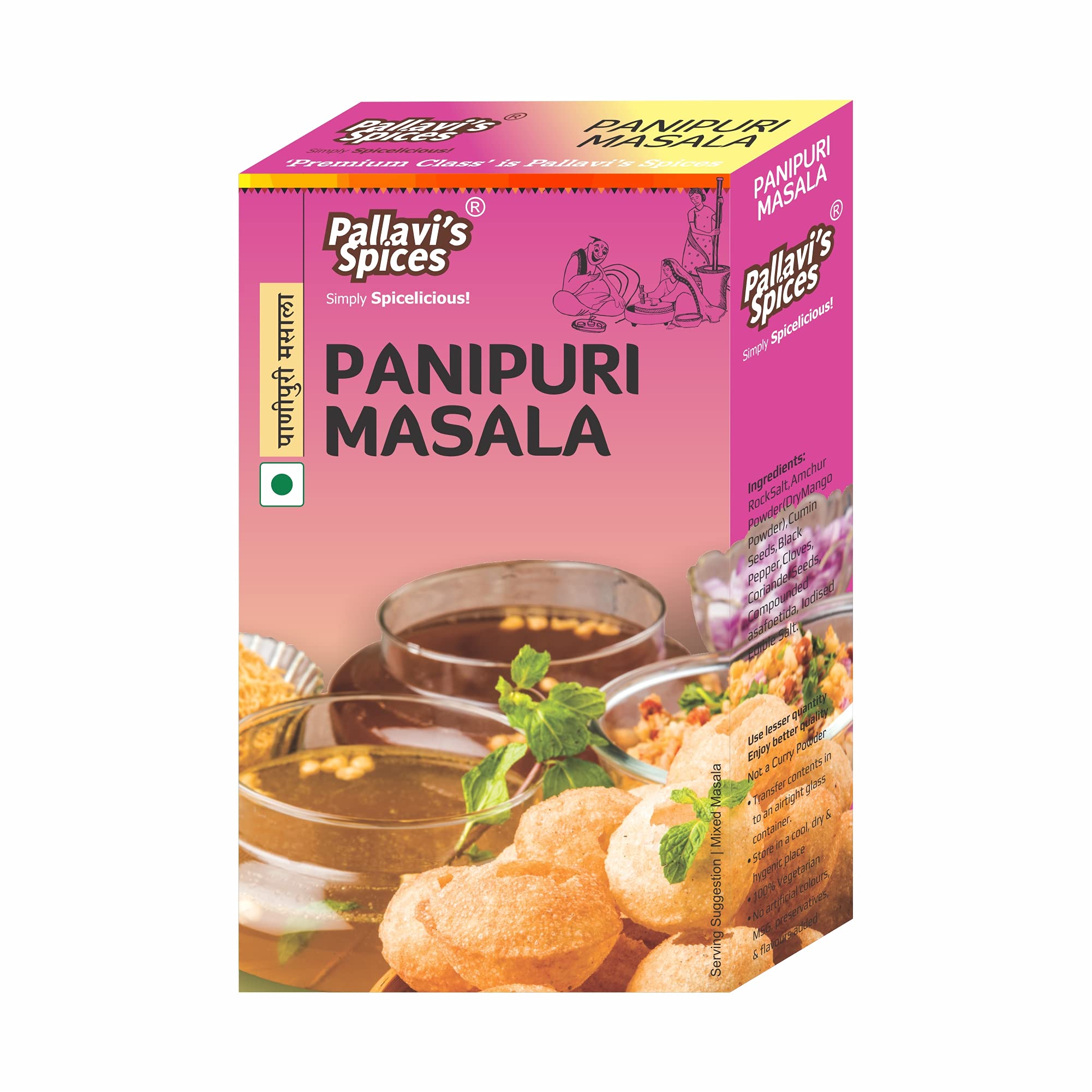 Panipuri masala of spices is made from best quality 8 ingredients. Use lesser quantity enjoy better quality. No added preservatives artificial flavours and msg. Without onion and garlic.