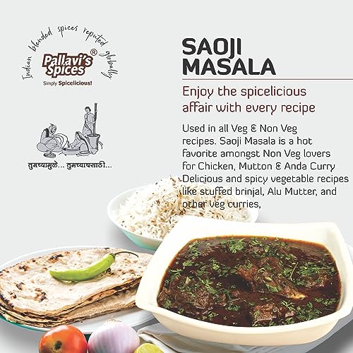 Saoji masala of spices is prepared by best quality 15 ingredients. Used in - chicken mutton fish egg curry and also in sev-bhaji drum sticks farsan bhaji potato-cauliflower misal stuffed brinjal pulses and gravy based vegetables. Use lesser quantity enjoy better quality. No added preservatives artificial flavours and msg.