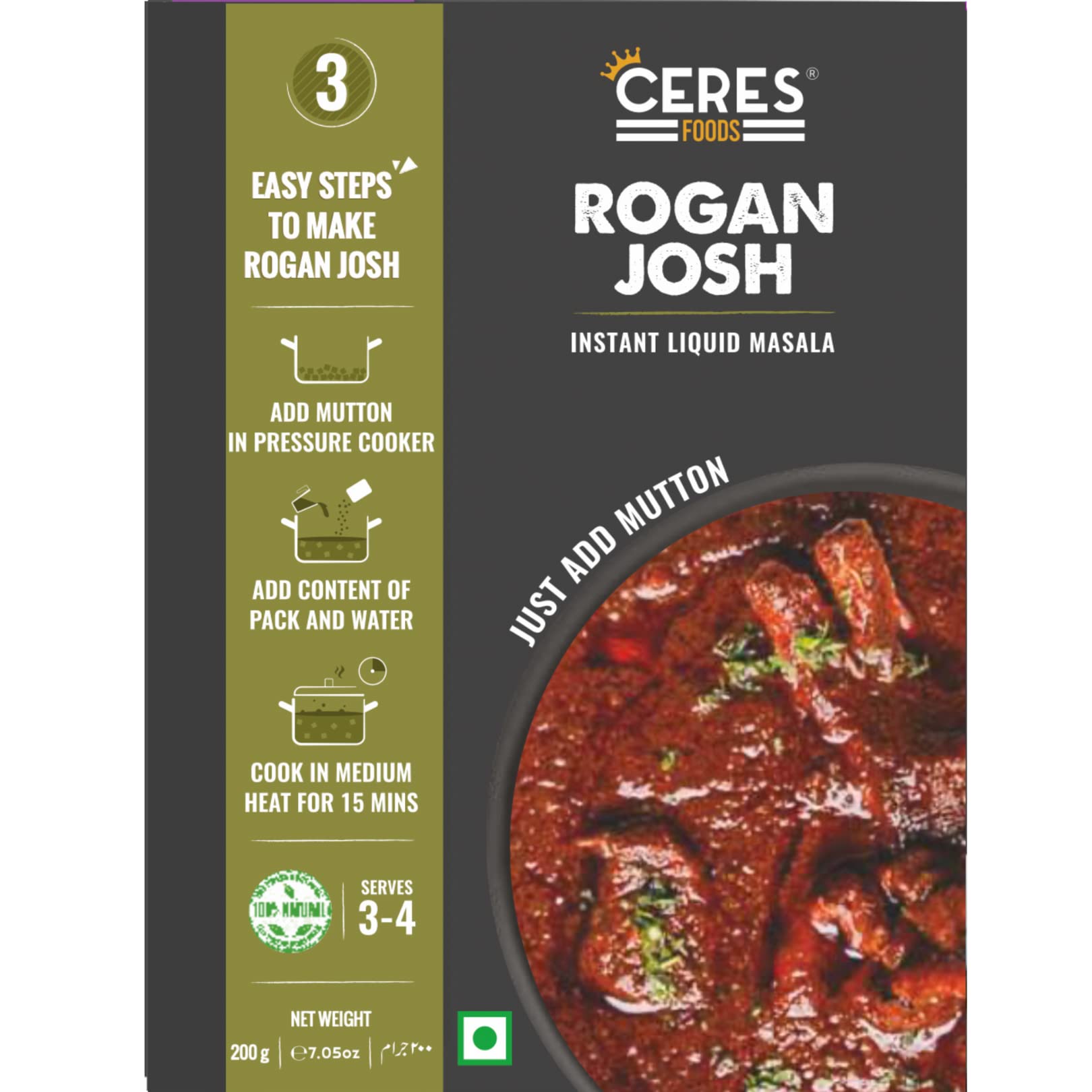 Onion (35.4%) Mustard oil (21.2%) Water (15.6%) Curd (14.2%) Ginger garlic paste (4.3%) Ghee (3.5%) Spices & Condiments (3.5%) Kashmiri chilli paste (2.1%) Ratanjot (0.2%)
