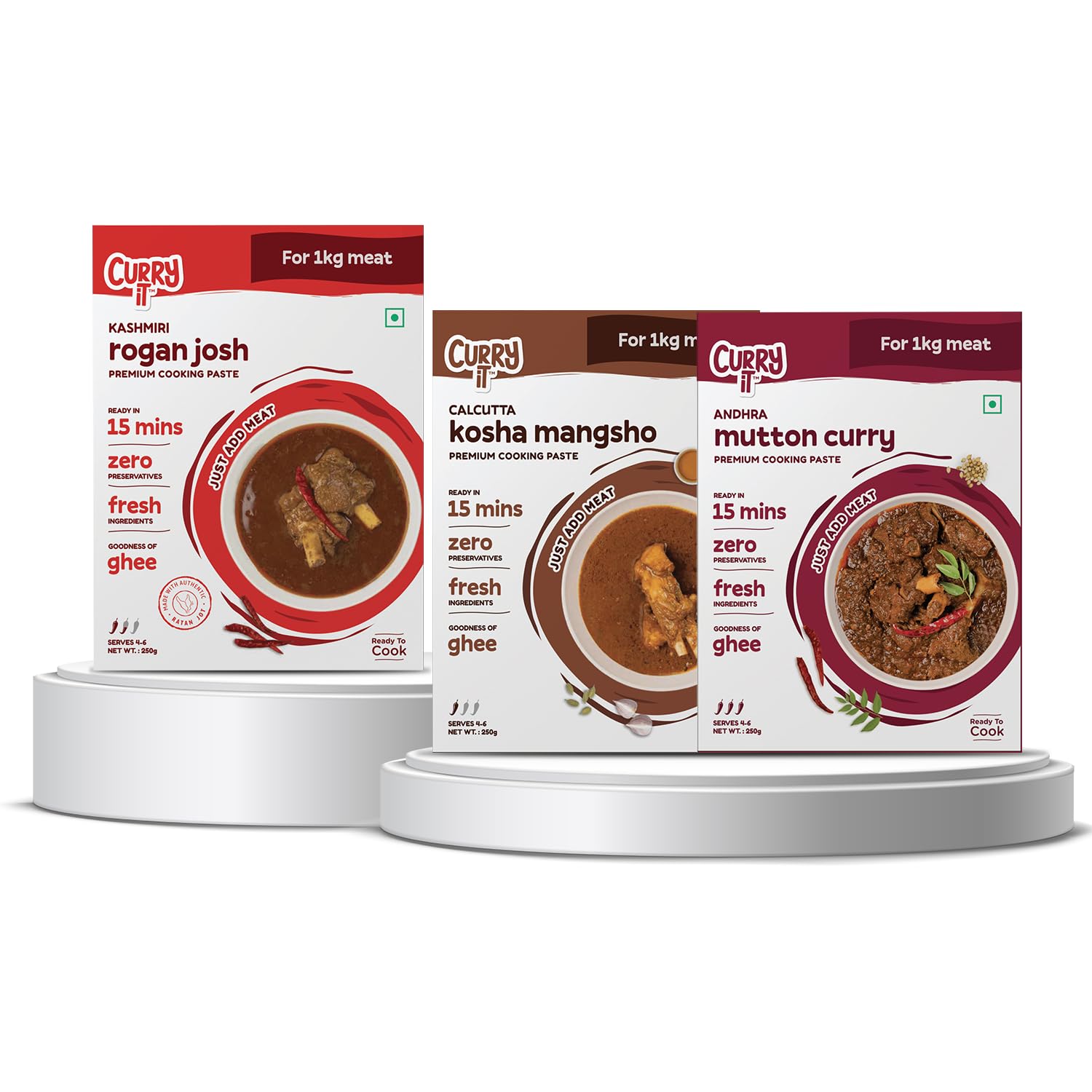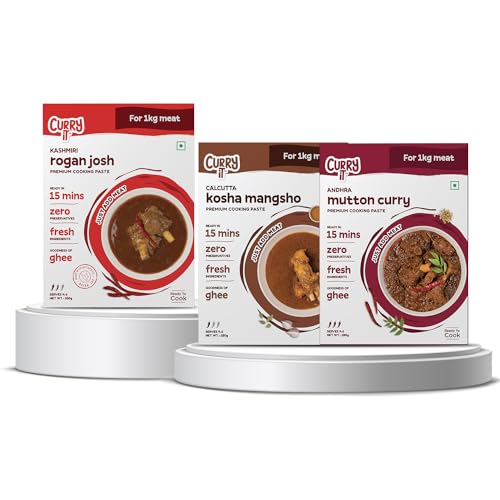 CURRYiT Ready to Cook Mutton Masala Combo Pack of 3 (250g each) Andhra Mutton Curry | Kashmiri Rogan Josh | Calcutta Kosha Mangsho | Add Mutton | Made with Ghee|Ready in 15 Minutes | No Preservatives