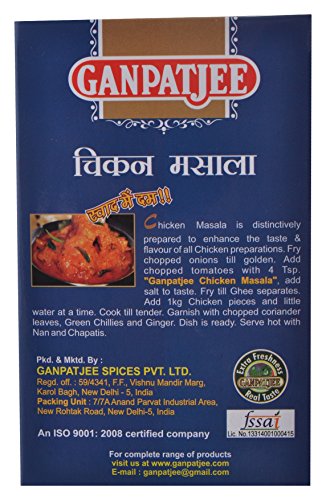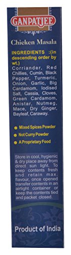About GanpatjeeGanpatjee believes in superior quality products with the best quality ingredients packed with due care .Chicken Masala Powder100 gmGanpatjee Chicken Masala is distinctively prepared to enhance the taste and flavour of chicken preparations keep it in a cool and dry place. To keep the contents fresh and retain maximum flavour once opened transfer the contents in an airtight container or keep the contents tied and packet closed. The magic touch for any chicken curry at your fingertips! The blend ensures your curry flavours will be balanced and tasty without overshadowing the other ingredients with its mild flavour serving as the perfect base for any chicken dish. We maintain the same standards of purity freshness and authenticity in every pack getting their aroma and flavour consistently right.Product Specifications:Product: Chicken Masala PowderQuantity: 100 GramIngredients: Coriander Chillies Cumin Turmeric Black Pepper Dry Ginger White Salt Cardamom Seeds Cloves Cinnamon Nutmeg Mace Onion Caraway Green Cardamom AsafoetidaProduct FeaturesServe it in meals like vegetables gravies and curriesVegetarian Product! No Artificial colours and No additivesPackage Includes:1*Chicken Masala Powder100 Gram