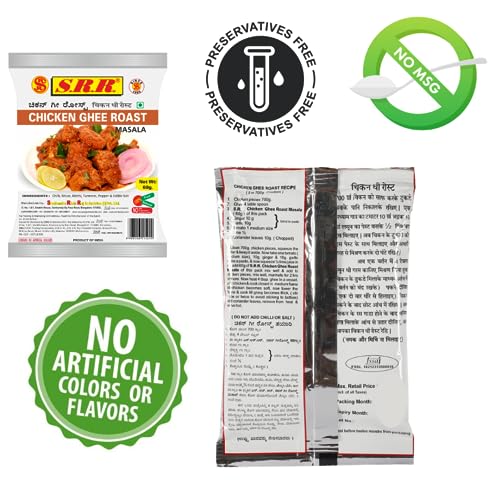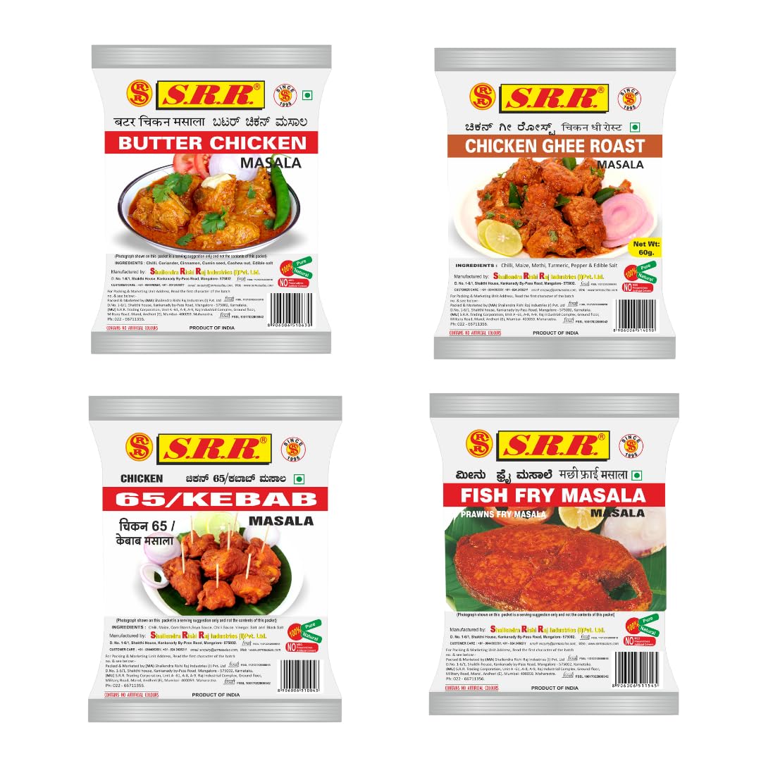 Gheeroast 60 grams Butter Chicken 50 grams Chicken 65/ Kebab 100 grams Fish Fry 100g (FREE SRR GINGER GARLIC PASTE 100 GRAMS & SRR HING POWDER RS.10) NO ARTIFICIAL COLOUR NO ARTIFICIAL FLAVOUR NO MSG