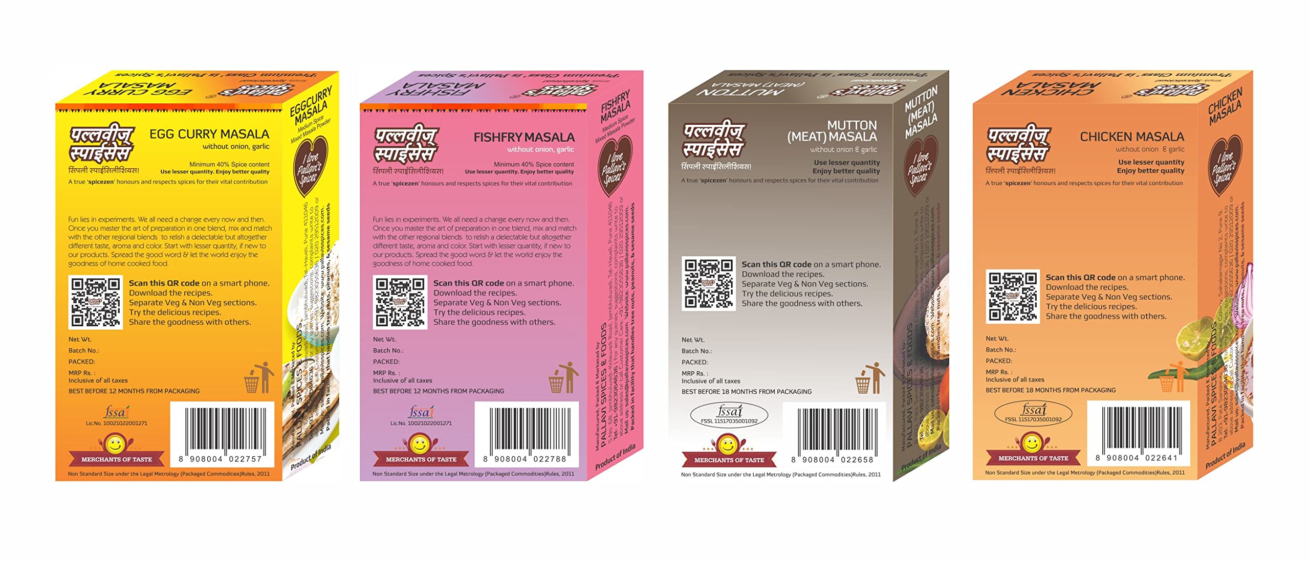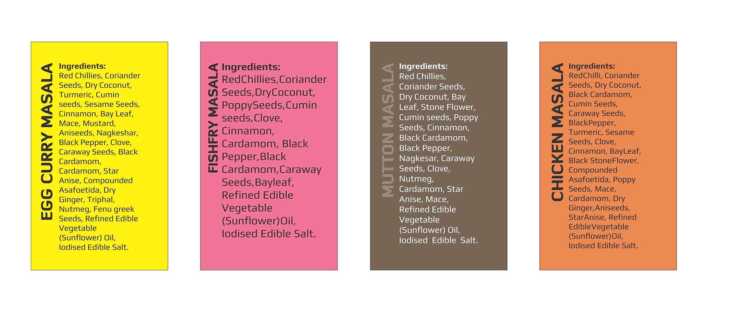 1 Anda curry masala 1 Chicken Masala 1 Fish Fry masala and 1 Mutton Masala of 50g each