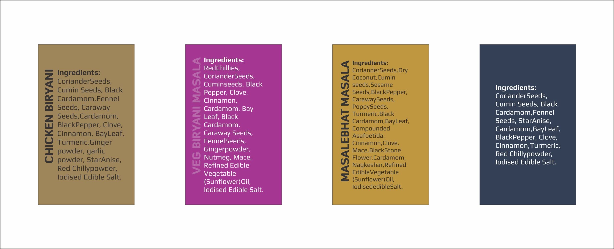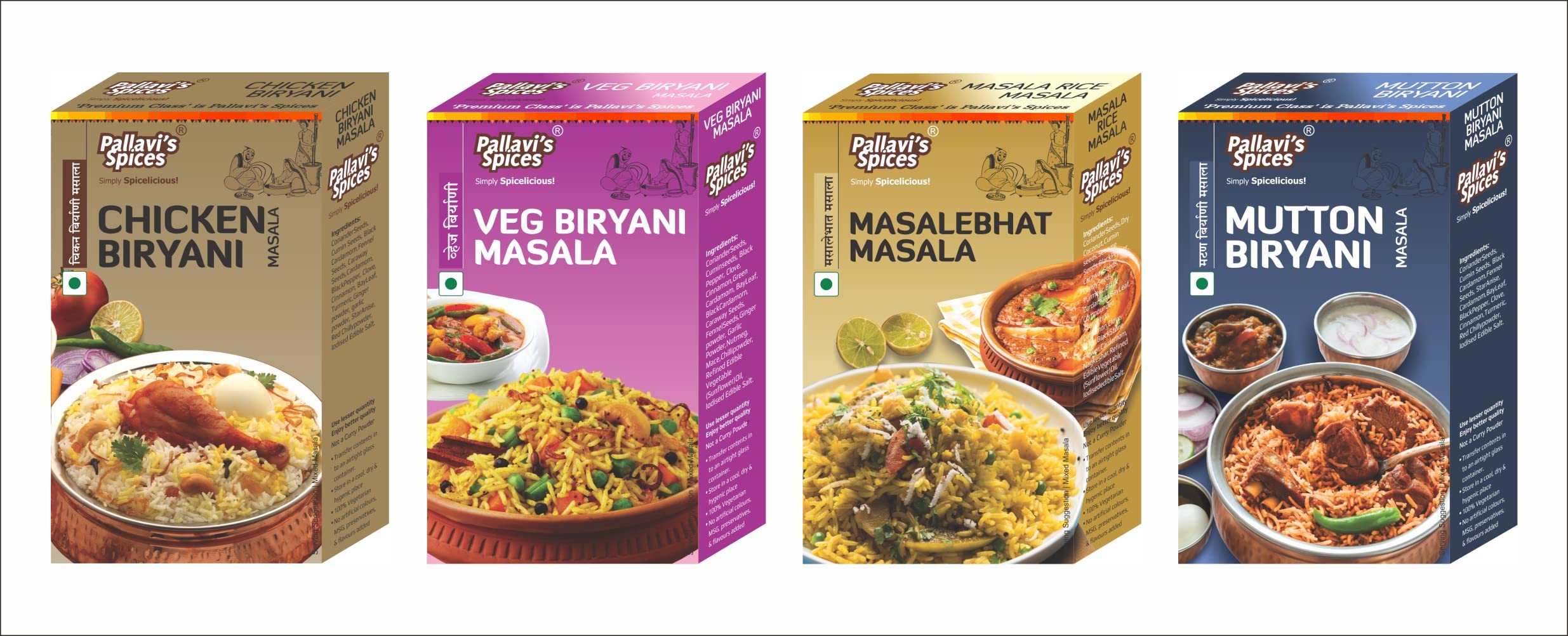 1 pack each of Chicken Biryani Masala Mutton Biryani Masala Veg Biryani Masala and Masalebhat Masala 50g each