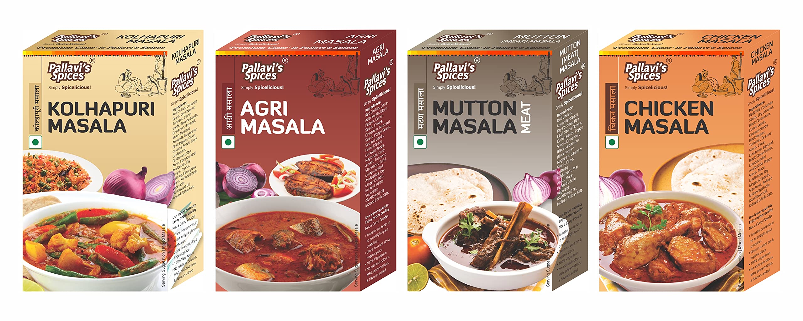 1 Kolhapuri Masala 1 Agri Masala 1 Chicken Masala and 1 Mutton Masala of 50g each