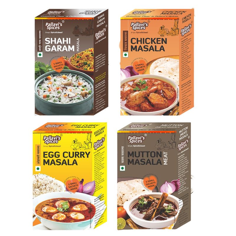 Pallavi's Spices Shahi Garam Masala (50gx1) Chicken Masala (50gx1) Mutton Masala (50gx1) & Anda Curry Masala (50gx1) | No Artificial Color | No Preservatives | Indian Masala | Pack of 4