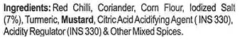 • Ingredients : red chilli coriander corn flour iodised salt turmeric mustard citric acid & other mixed spices