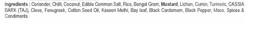 • Ingredients: Coriander Chilli Coconut Edible Common Salt Rice Bengal Gram Mustard Lichen Cumin Turmeric Taj Clove Fenugreek Cotton seed Oil Poppy Seeds KasooriMethi Bay Leaf Black Cardamom Black Pepper Mace. Spices and condiments