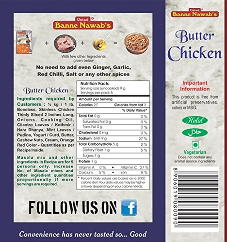 Ready to cook spice blends for gourmet cuisine Gourmet Mughalai 45 GR Spice Blend For Butter Chickeni; Just Mix & Cook Servings Per Pack: 5; Serving Size(uncooked): 9 g; No need to add even Ginger Garlic Red Chilli Salt or any other spices