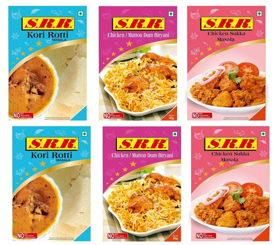 A Combination of chicken Sukka Masala 80 gram 2 Pack and Chicken Kori Roti Masala 80 gram 2 Pack and Chicken Dum Biryani 50 grams 2 Packs