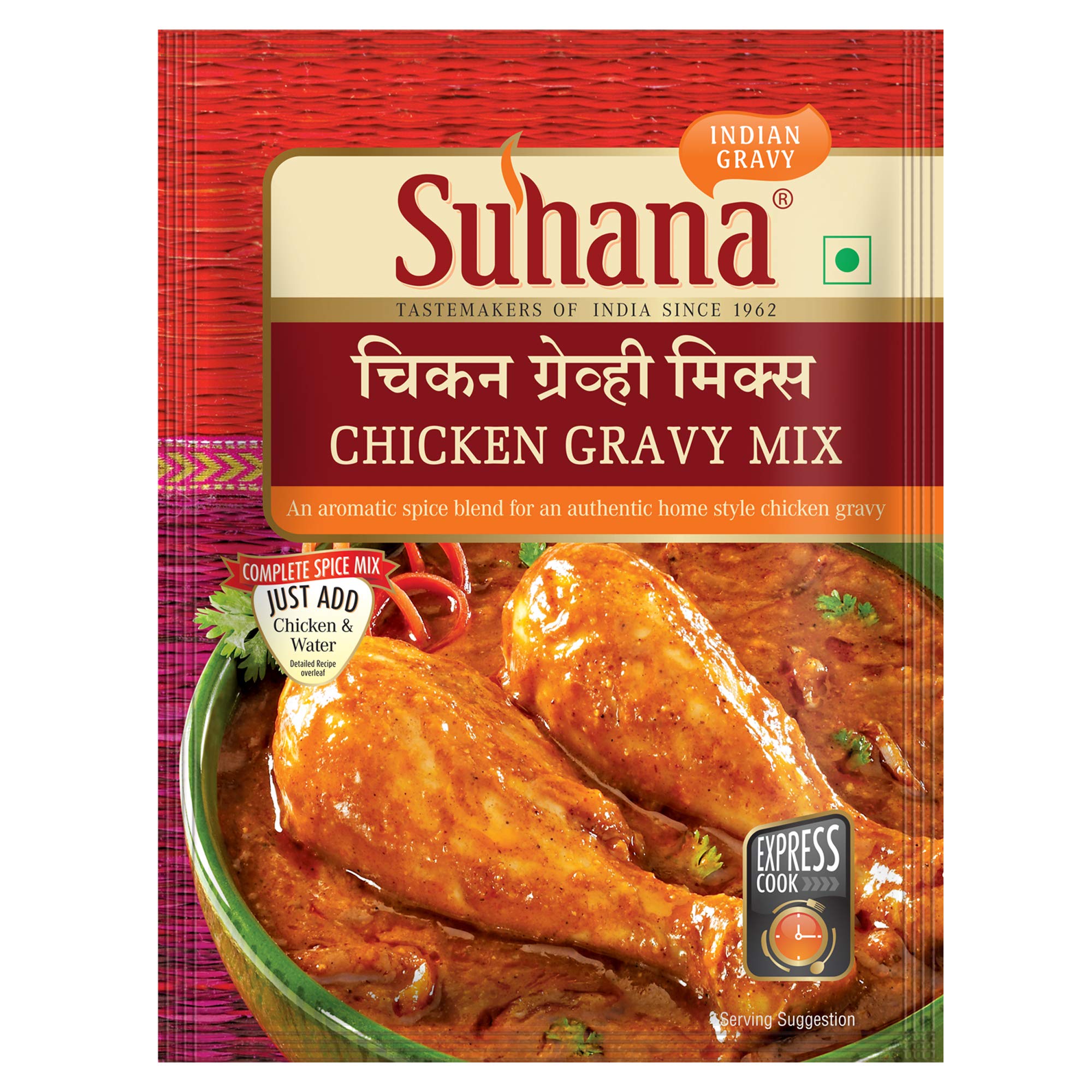 Suhana Chicken Biryani Masala Mix Easy to CookPart of the culinary legacy of the Mughal Empire biryani Is made with fragrant long grain basmati rice and meat/chicken or vegetables marinated in yoghurt and a multitude of spices. Use Suhana Chicken Biryani Mix to create a truly memorable meal! Chicken BiryaniCooking Time: 40 MinutesServes: 4Dish category: Main CourseIngredients Required: 1 Cup / 200g Rice5 Cups Water1 tbsp Salt500g Chicken Cut into 1 Inch Pieces½ Cup / 100g Curd50g Suhana Chicken Biryani Mix3 tbsp Ghee / Oil1 Onion Chopped½ Cup Fresh coriander leaves Chopped¼ Cup mint leaves ChoppedA Pinch of saffron mixed with a little lukewarm milkHalf cup crisp fried Onions for garnishingSteps1- Wash and soak rice for 15 minutes and drain2- Boil water add rice Salt and 1 tbsp oil and cook for 4-5 Minutes till rice is half done. Drain water completely and set aside. 3- Make a paste of curd and Suhana Chicken Biryani Masala and Marinate chicken with this. Keep aside for 1 hour. 4- In a large frying pan heat remaining oil add Onion and saut until golden brown. Add marinated chicken and cook for 20-25 minutes or till it is tender. 5- Place the chicken in a Heavy bottomed casserole or pan cover with rice. 6- Sprinkle coriander mint and saffron-infused milk on it. Cover and cook on low heat for about 10 minutes. Garnish with crisp fried onion mix well and serve hot. Suhana Tip: For best result use Chicken drumstick instead of boneless chicken. For Vegetarian version replace chicken with 400g vegetables of your choice.