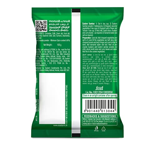 Eastern sambar powder is a perfect blend of ancient Indian cooking tradition and soul ravishing taste of authentic homemade food that reminds you of your mother's love. Sourced from the foothills of western ghats we utilize exotic spices that are hand-picked sun-dried and hand roasted. Treat your family to an authentic south Indian meal and enjoy the delightful Eastern sambar powder everyday.