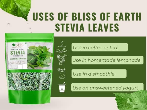 Do you have a sweet tooth? Trust Mother Earth who has endowed us with a sterling alternative to sugar-one that tastes at least 200 times sweeter that sugar. Yes its Bliss of Earth Certified Organic Stevia leaves that possesses everything in it to replace the sugar going in your diet. It has an extremely low calorific value almost making it to the "no calorie" food category. As a result it helps control diabetes and also aids in one's weight loss journey. loaded with a sterling antioxidant compound profile such as - flavonoids triterpenes tannins caffeic acid amidst many others stevia's consumption as a part of one's regular diet helps endow one with a host of skin benefits. from preventing damage caused by free radicals floating around us to enhancing one's skin's appearance Stevia is surely notches above regular sugar {that possesses zero nutritive value} additionally Stevia's consumption does not promote tooth decay or a slew of oral problems unlike sugar's intake does. from preventing osteoporosis to strengthening bones here's a gem of mother nature that we at Bliss of Earth are pleased to present to you with all its goodness intact!