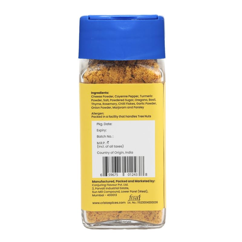 100% NATURAL CHEESE POWDER: CRISTA Creamy Cheese Powder utilises high quality cheddar cheese powder blended with spices like Cayenne Pepper and Turmeric Powder and infused with herbs like Oregano Basil Rosemary and Parsley to give a bold cheesy flavour wi