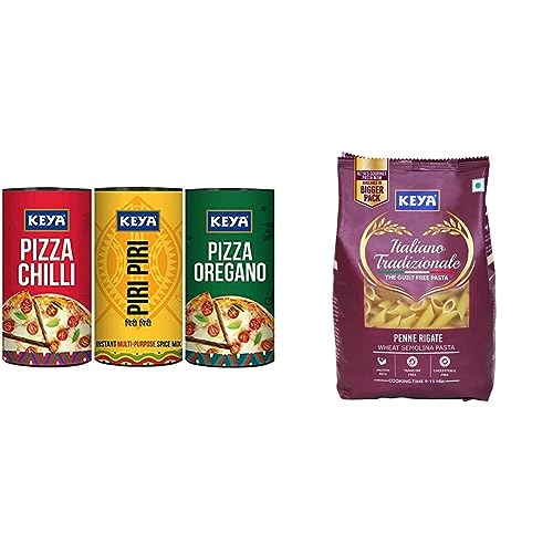 Keya International Sprinklers Combo | Italian Pizza Oregano 80gm | Piri Piri 80gm | Italian Pizza Chilli 70gm | Pack of 3Flavour: IPO plus IPC plus piri piri Keya international sprinklers combo- Italian pizza oregano 80g piri piri 80g Italian pizza chilli 70g.Keya Penne Pasta 1kg 100% Durum Wheat Pasta | Vegetarian | No MSG | Low in Calories | No Trans Fats | Healthy | Cooked in 10 MinutesInspired by Authentic Italian Culinary Keya Gourmet Pasta has been crafted from finest Durum Wheat Semolina to satisfy your cravings for authentic Italian Pasta