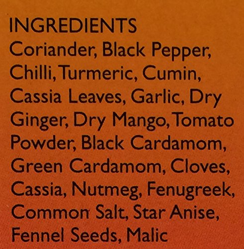 Coriander black pepper chilli turmeric cumin cassia leaf garlic dry ginger dry mango tomato powder black cardamom green cardamom cloves cassia nutmeg common salt fennel seeds