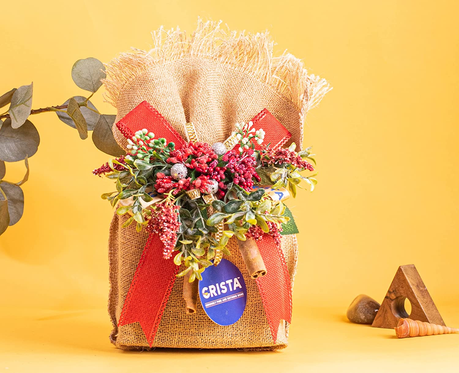EXCLUSIVE SPICE TRADITIONAL JUTE POTLI: Tired of the same mithai chocolate and dry fruit gift hampers? We are delighted to annouce that the time for the same mundane 'desi' food gift boxes is over! CRISTA Earthy Spice Potli are a delightful package of goo
