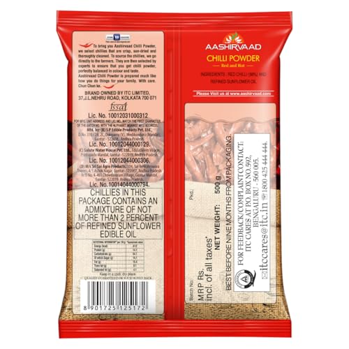 Aashirvaad Chilli Powder has been made with love in India using the 4-step advantage process to ensure that only a high-quality product reaches your kitchen. With a network of over 10000+ farmers Aashirvaad sources chillies directly from the farmers. The chillies are then carefully selected by experts which are then traditionally sun-dried and thoroughly cleaned to get a chilli powder that is perfectly balanced in colour and taste. The automated packaging and processing with zero human intervention ensures purity in every pack. With no added flavours and colours Aashirvaad Chilli Powder is so potent that even a small quantity enhances the colour and flavour of the dish. So just add a pinch of this chilli powder to bring alive the vibrant colour and spiciness of your dish! About Aashirvaad: Aashirvaad stands for purity expert sourcing and quality and believes in giving you nothing but the best. Hence the ingredients are carefully hand-picked and processed with the same love and care with which you prepare your food. Aashirvaad has a wide range of products - atta ghee salt spices and instant mixes. To lock in the freshness and nutritional quality of the products Aashirvaad uses world class packaging technology to retain the flavour and high quality About ITC ITC is one of India's foremost companies with its presence in FMCG Hotels Packaging Paperboards & Specialty Papers Agri & IT Businesses. ITC Brands are designed and customized to delight diverse tastes needs and lifestyles. With quality and innovation at the core along with contemporary packaging customer insights and a formidable nationwide distribution network ITC has been delighting millions of households every day since 1910. A brand that is made in India for the world