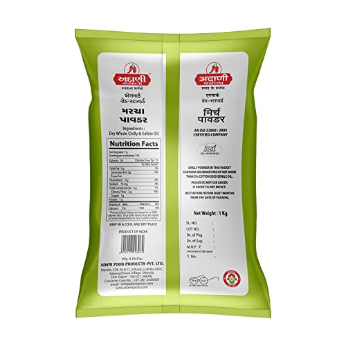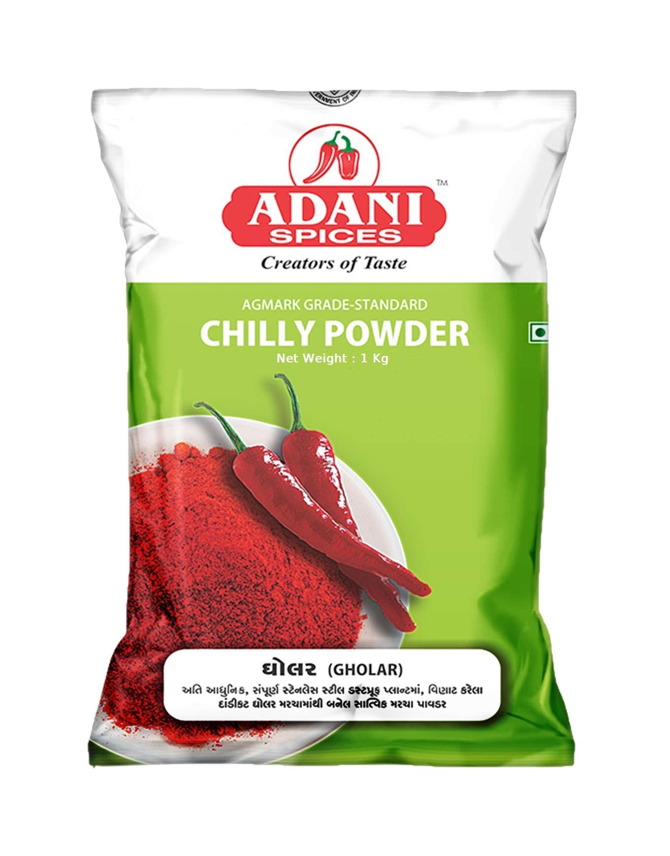 Adani Spices Gholar Red Chilli Powder is Made from hand select stemless pure gholor chillies sourced from the place of origin - Saurashtra District in Gujarat & processed in our state of the art factory with air wash technology. Adani seal of quality!! For over 65 years Adani has provided its customers with products of unparalleled purity and quality. sourced directly from its place of origin each product is processed and packed at our factories to meet international food safety standards. And when added to your favorite recipes Adani Spices ensure full and rich flavour in every bite.DEDICATED TO QUALITY: Made from hand select stemless pure gholor chillies sourced from the place of origin - Saurashtra District in Gujarat & processed in our state of the art factory with air wash technology.USES: You Can Use it in Dal Tadka Vegetables & other Delicacies in the kitchen.FLAVOUR: A mild spicy chilli powder.EXPIRY: 8 Months From The Date of Manufacturing.ISO CERTIFIED: Adani Spices Has An Experience over 65 Years!!! A Quality Product From ISO 22000:2018 certified company.