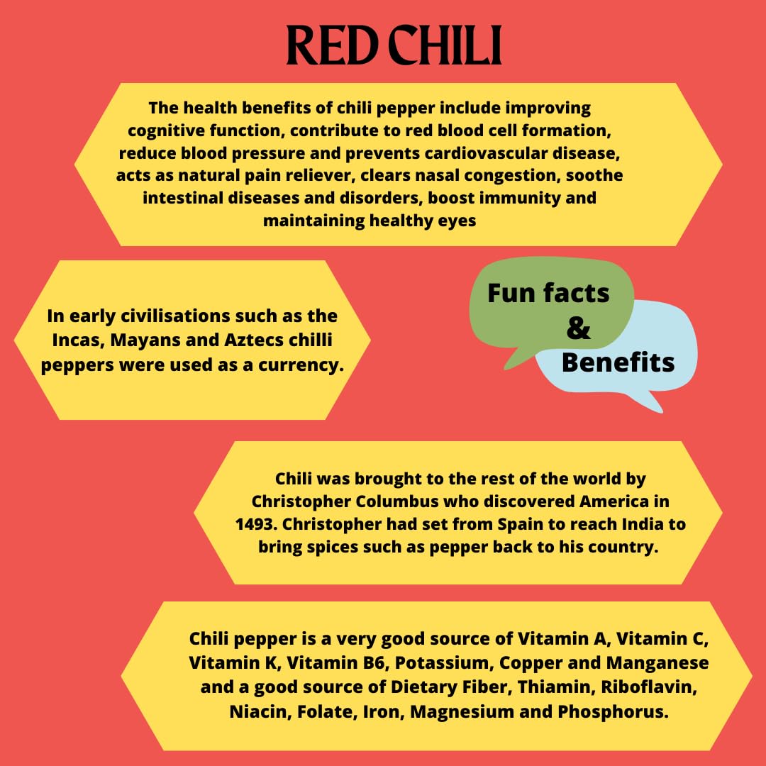 • Finest grade Guntur Chillies are carefully handpicked dried and packed hygienically to ensure superior quality. It can be added to curries vegetable dishes tomato sauce soups stews and any dish if you wish to give a chilli taste.