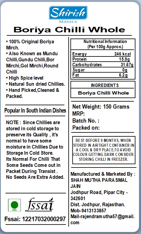 All our packs are hygienically packed while maintaining strict quality standards to rule out chances of bug infestation or any other kind of contamination. ingredients: dry boriya chilli