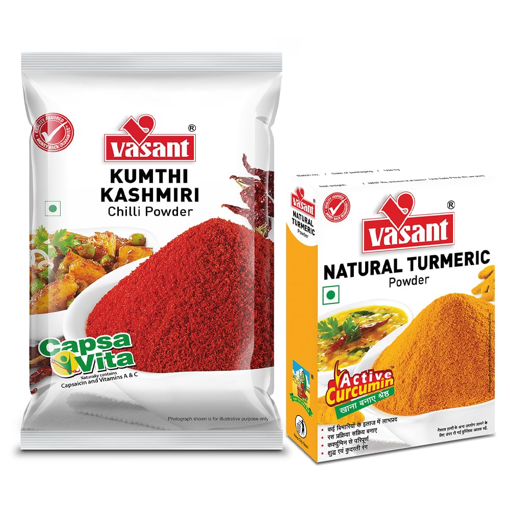 VASANT Chilli & Turmeric Powder Combo | Combo Pack (Kumthi Kashmiri Chilli Powder 500 gm & Natural Turmeric Powder 200 gm) | Chilli Kashmiri Kumthi | Turmeric Halder Haldi | Immunity Booster | Indian Spices & Masala