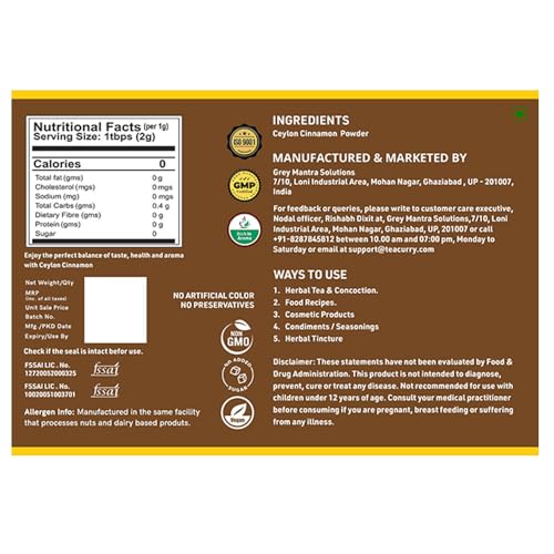 Vegan-Friendly - Teacurry Organic Ceylon Cinnamon Powder: A vegan-friendly delight thoughtfully crafted with pure plant-based ingredients. Elevate your culinary experience guilt-free with our commitment to diverse dietary preferences.