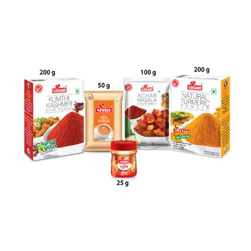 • Package Include : Vasant Kumthi Kashmiri Chilli Powder 200g Vasant Natural Halder Powder 200g Vasant Tea Masala 50g Vasant Strong Hing 25g Vasant Achar Masala 100g