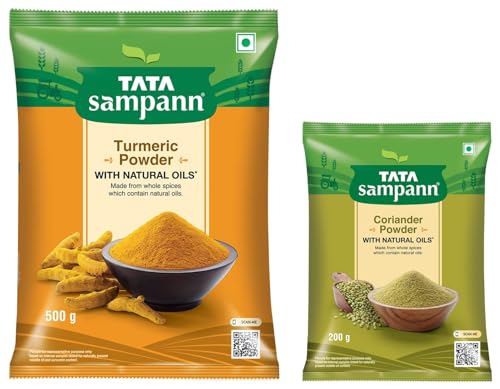 Tata Sampann Turmeric Powder With Natural Oils 500gTata Sampann's range of spices are crafted not just to satisfy your taste buds but also to take care of your health. Made from whole spices that contain natural oils haldi has an active ingredient called curcumin. With no added preservatives this turmeric powder can be teamed up with pulao greenies vegetable soup or smoothies the choice is yours! Storage Instructions: Store in a cool and dry place.Tata Sampann Coriander Powder With Natural Oils 200gTata Sampann's range of spices are crafted not just to satisfy your taste buds but also to take care of your health. Made from whole spices that contain natural oils coriander gets its properties and taste from its naturally occuring volatile oils. With no added preservatives this dhaniya powder can be teamed up with paranthas aloo sabzi or rasam the choice is yours! Storage Instructions: Store in a cool and dry place.