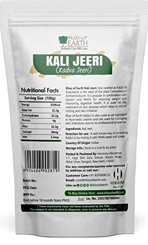 Bliss of Earth Kali Jeeri (also spelled as kalijiri & kaali Jeera) is the seed of the plant Centratherum anthelminticum. It is poplar in combination with Ajwain and Methi for reducin weight and improving digestive health. It is used for the treatment of skin which helps to reduce itching and skin irritation. Bliss of Earth Kalijiri is also used as an ingredient in Ayurvedic creams and oils used for managing skin infections due to its antibacterial properties.
