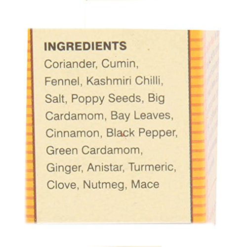 Contains Coriander CuminFennel Kashmir chilli Salt Poppy seeds Big cardamom Bay leaves Cinnamon Black pepper Green cardamom Ginger Anistar Turmeric Clove Nutmeg Mace