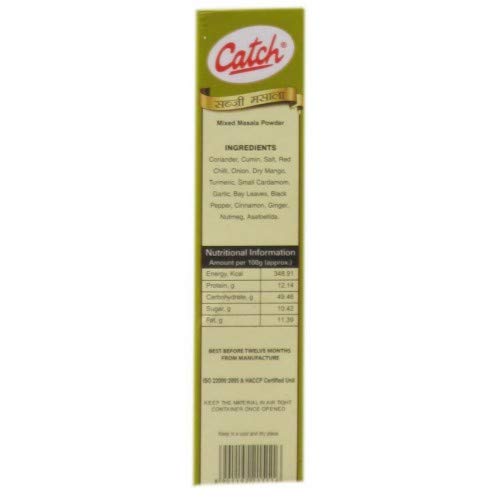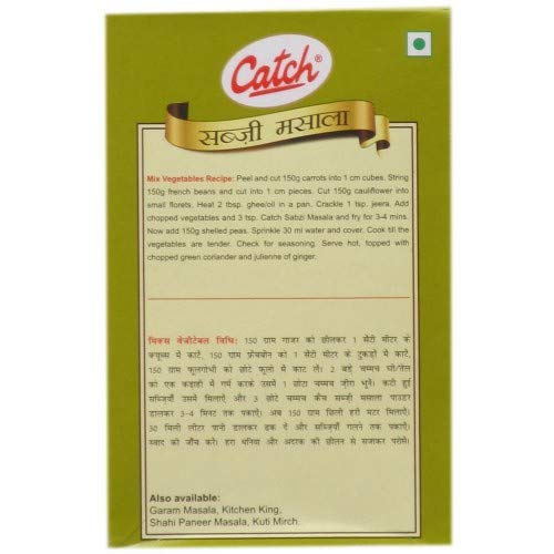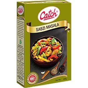 CATCH SPICES SABZI MASALA 100G Ingredients: Coriander Cumin Chilli Turmeric Black Pepper Cloves Fenugreek Leaves Salt Nutmeg Dry Ginger Cardamom Seeds Cinnamon Bay Leaf Pulse Fennel Caraway Mustard Garlic Flakes Onion Flakes Mace Green Cardamom Asafoetida.