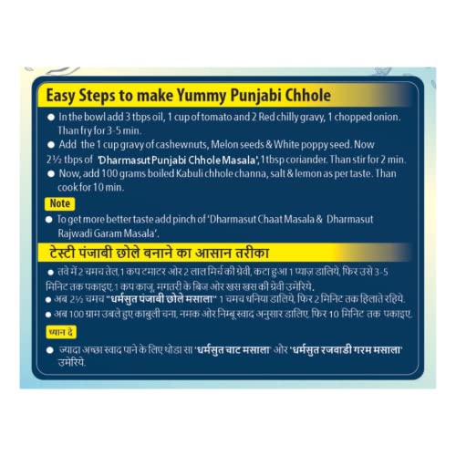Dharmasut Punjabi chhole masala is natural which gives you a freshly grounded taste of masala. If you want to make restaurant Style Chole at home then Dharmasut chhole masala is best for you. By using our chhole masala powder you will get spicy tangy and dark-colored punjabi chhole at home.