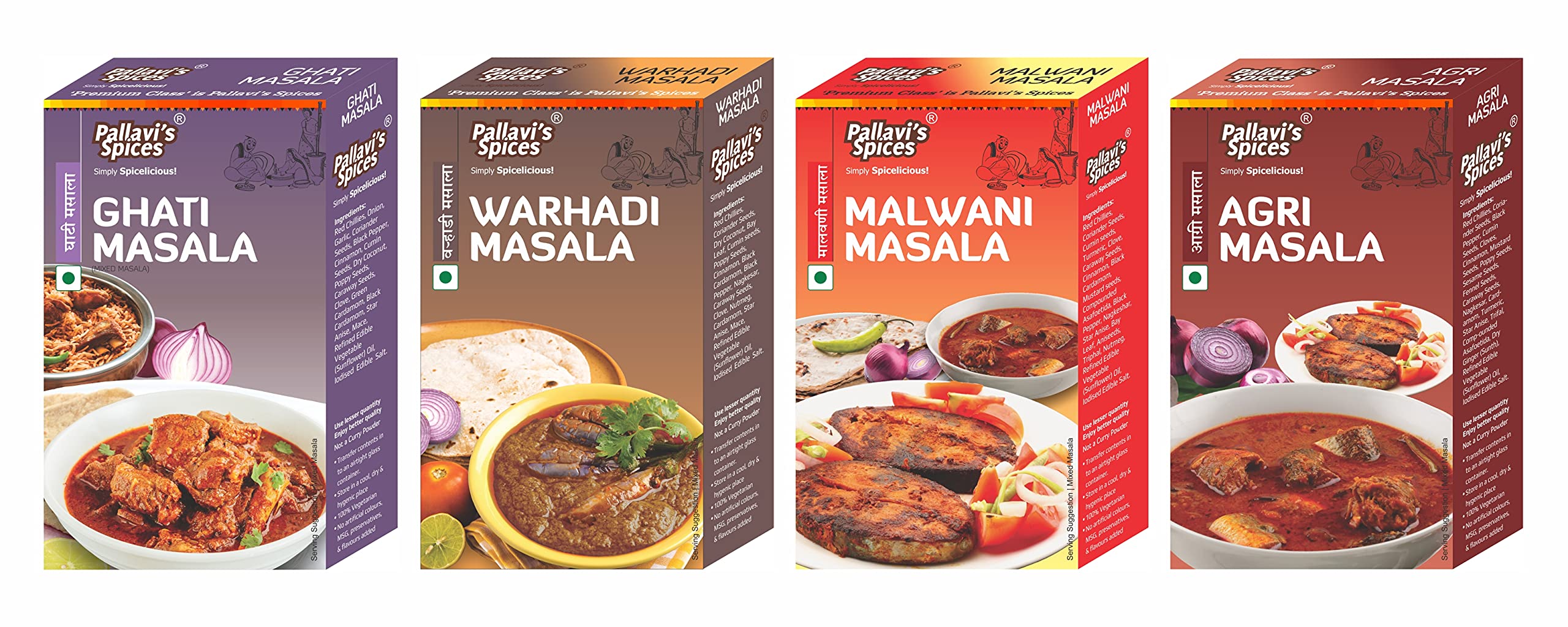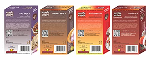 1 Spices Ghati Masala 1 Warhadi Masala 1 Malwani Masala and 1 Agri Masala. 200g combo pack of 4 different masalas (blended spices)