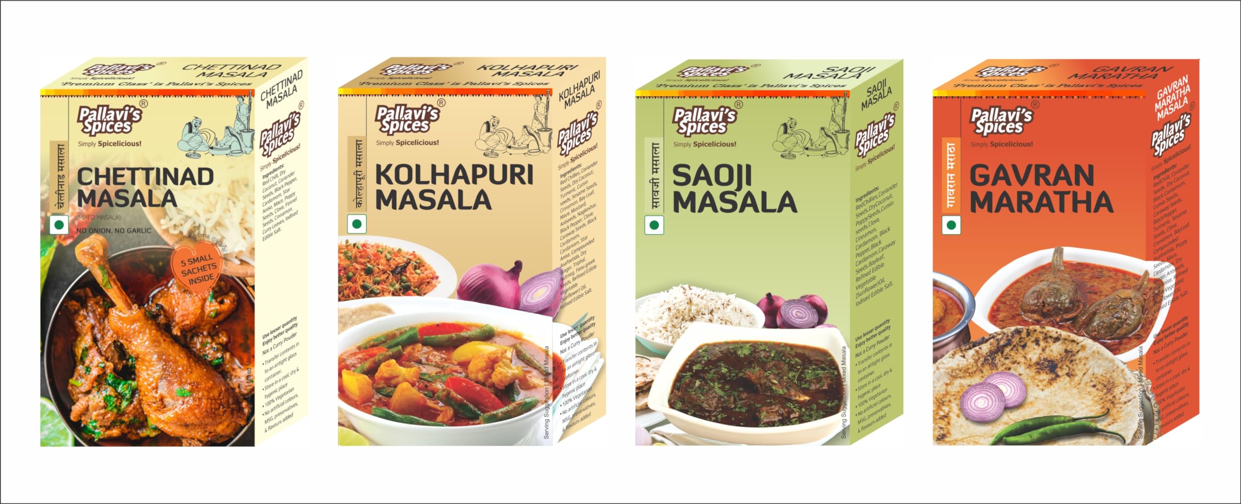1 packs of Chettinad + Kolhapuri + Saoji + Gavran Masala 50g each