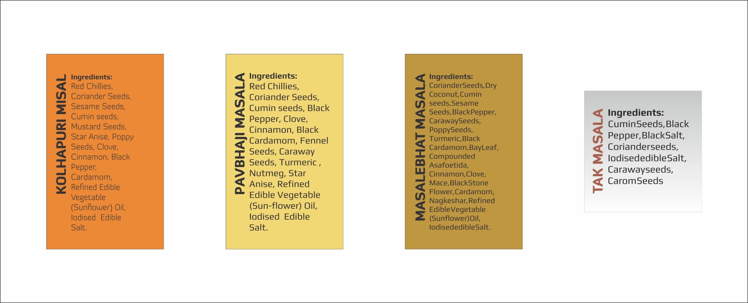 1 pack of Kolhapuri Misal masala Pavbhaji Masala and Masalebhat masala in 50g each and Tak Masala 100g