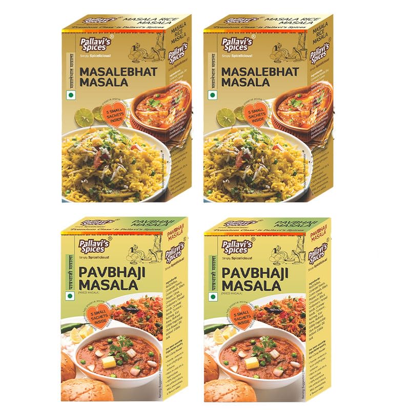 Pallavi's Spices Masalebhat Masala (50gx2) Pavbhaji Masala (50gx2) | No Artificial Color | No Preservatives | Indian Masala | Pack Of 4