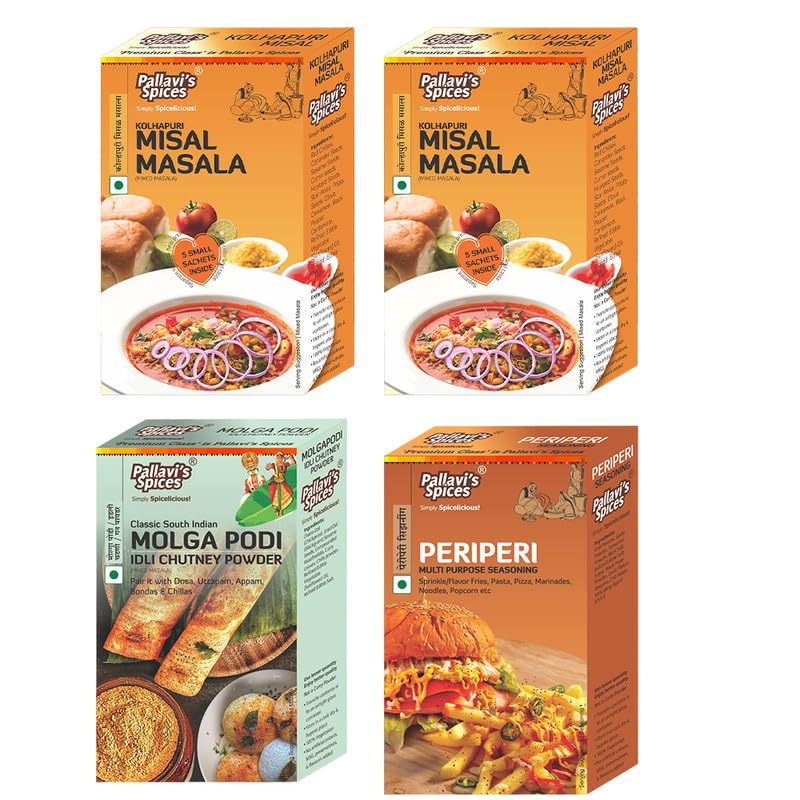 Pallavi's Spices Misal Masala (50gx2) Periperi Masala (50gx1) Molgapodi Masala (100gx1) | No Artificial Color | No Preservatives | Indian Masala | Pack Of 4