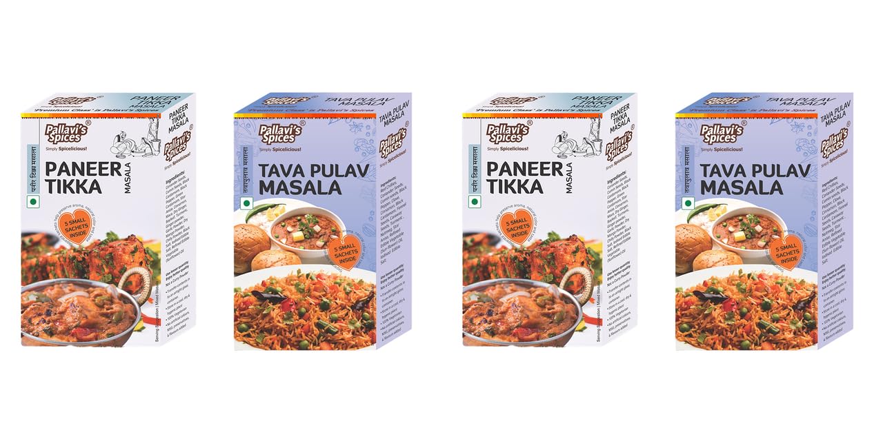 Pallavi's Spices Paneer Tikka (50gx2) and Tava Pulav Masala (50gx2) | No Artificial Color | No Preservatives | Indian Masala | Pack of 4