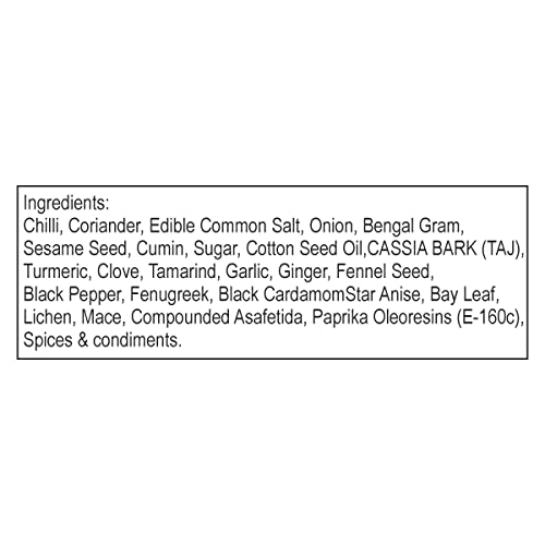• Ingredients: Chilli Coriander Edible Common Salt (11%) Onion Sesame Seed Cumin Sugar Cotton Seed Oil CASSIA BARK (TAJ) Turmeric Clove Tamarind Garlic Ginger FennelSeed Black Pepper Fenugreek Black Cardamom Star Anise Bay Leaf Lichen Mace Compounded Asafoe