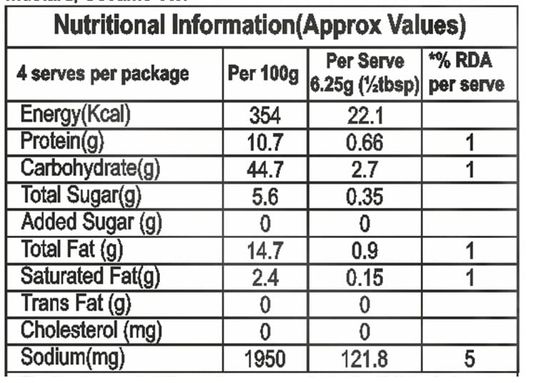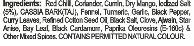 • Ingredients : coriander red chilli cumin dry mango iodized salt cassia bark (taj) fennel turmeric garlic black pepper curry leaves refined cottonseed oil black salt clove ajwain star anise bay leaf black cardamom paprika other mixed spices